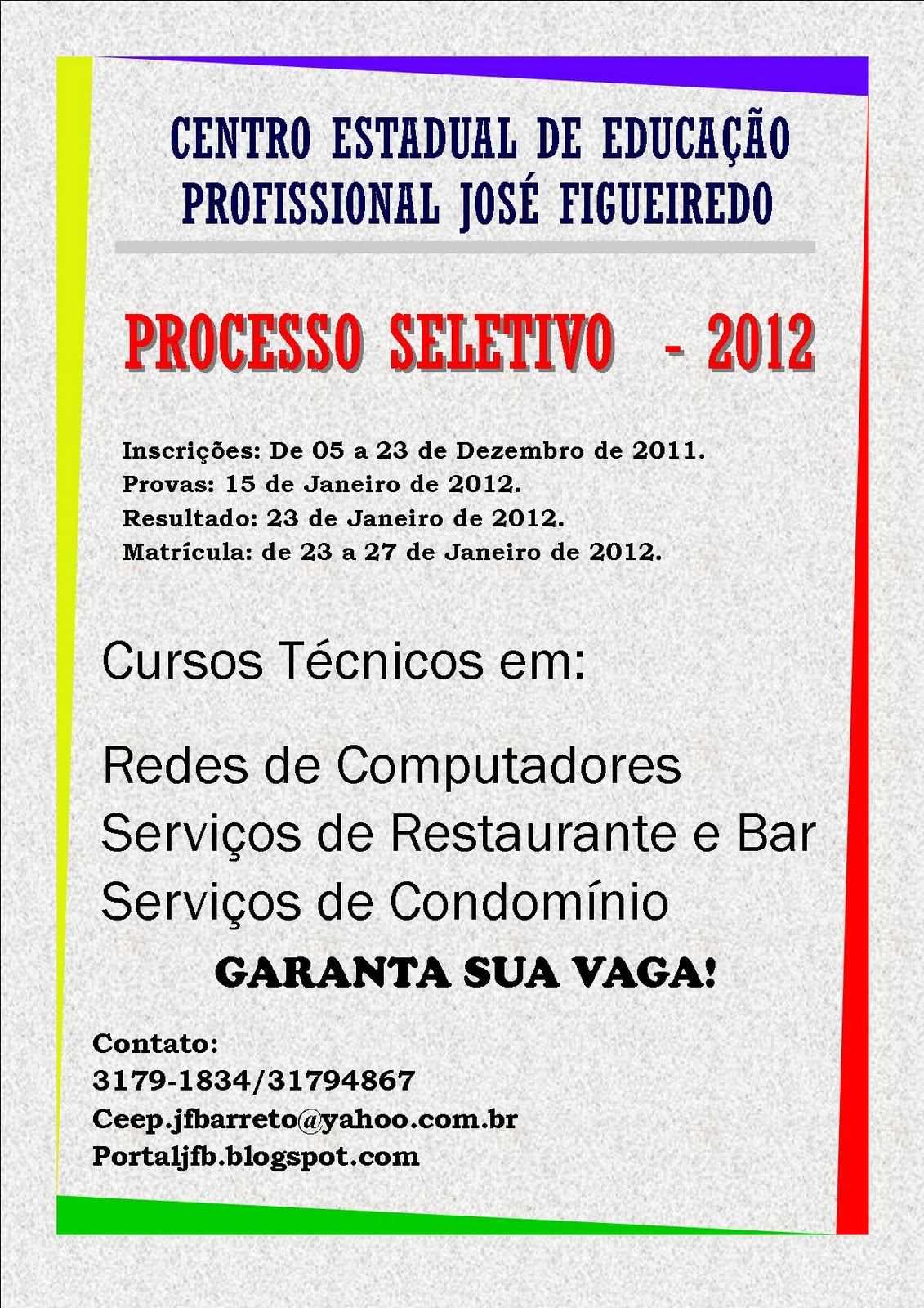 O Centro Estadual de Educação Profissional José Figueiredo Barreto , localizado em Aracaju, está com as inscrições abertas para os cursos técnicos em Serviços de Condomínio, Serviços de Restaurante e Bar, Redes de Computadores, na forma subsequente